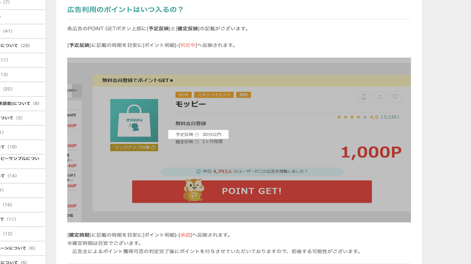 ポイントがいつ付くのかは、利用している広告の確定反映時期を確認してください。