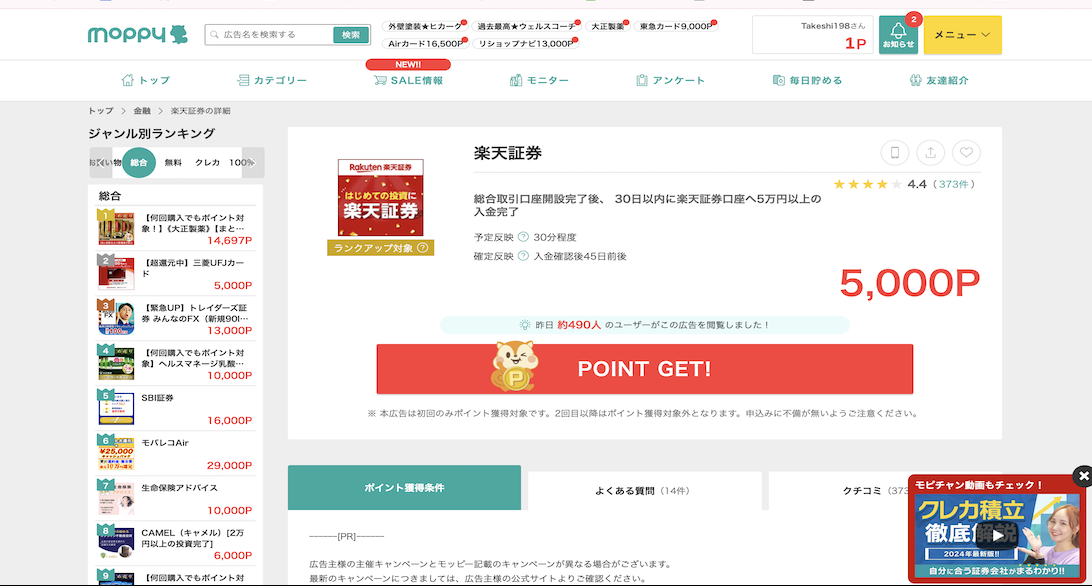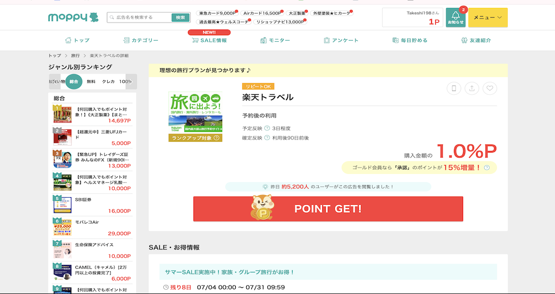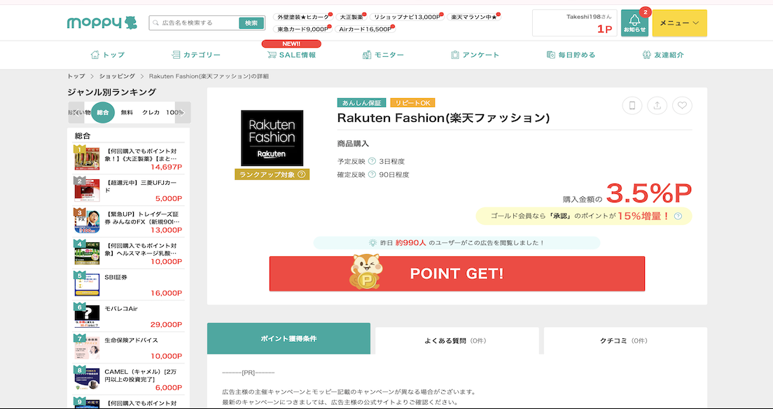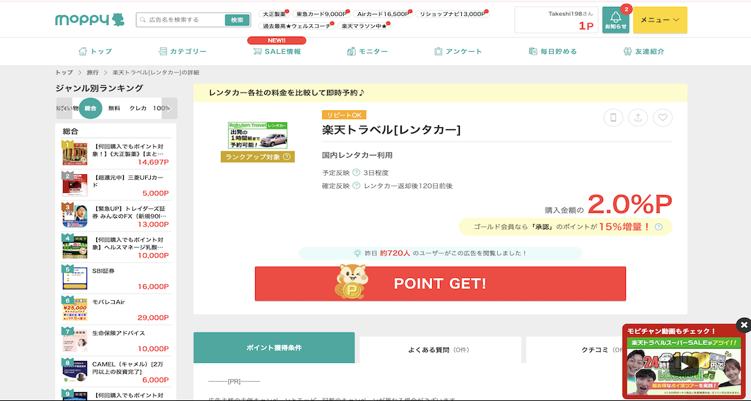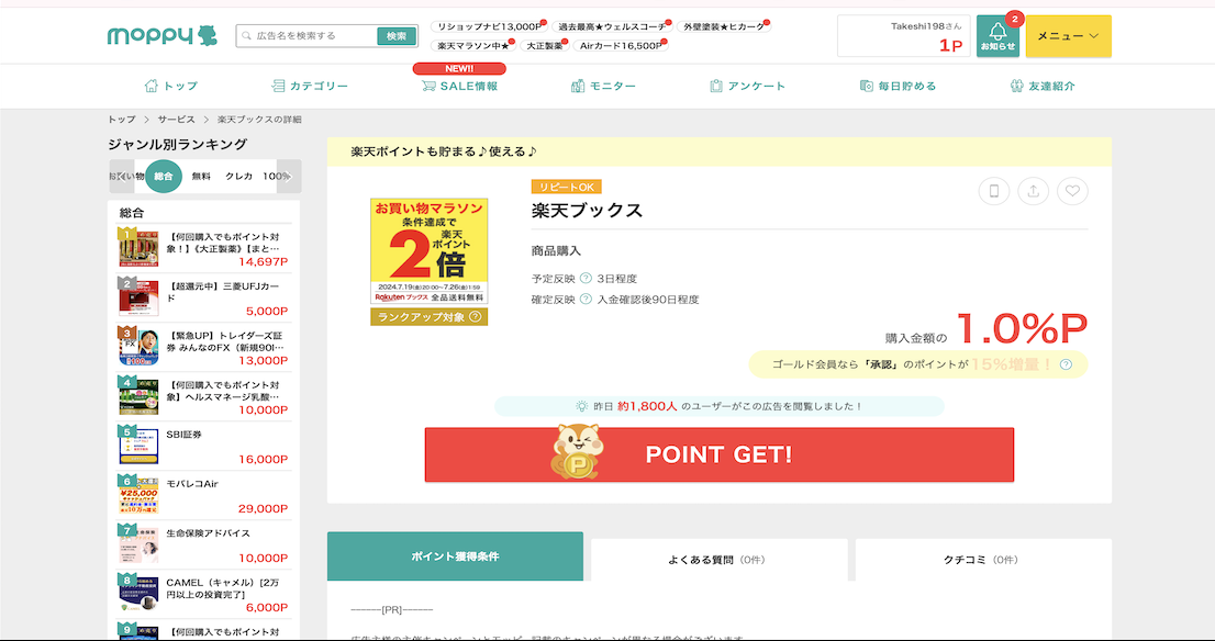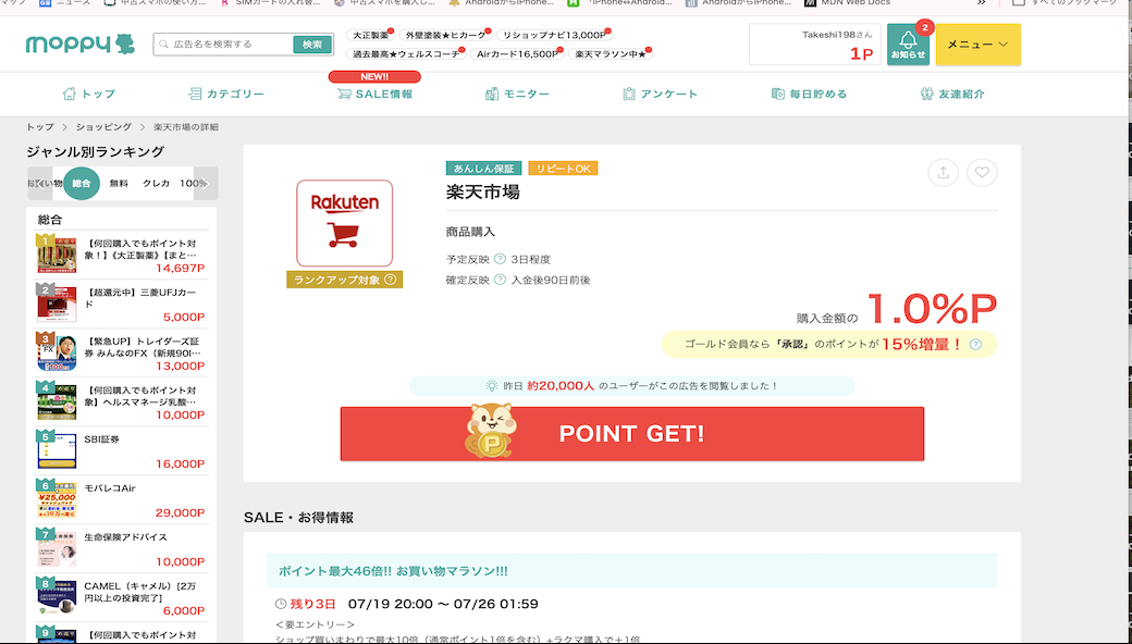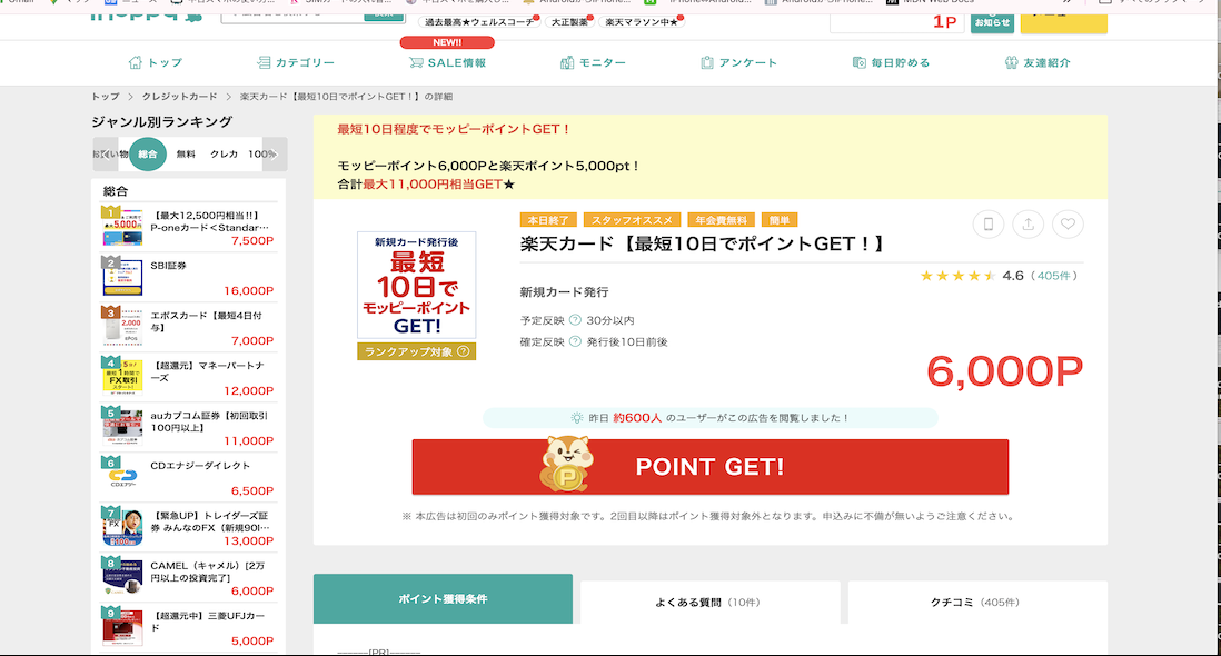 以下はモッピーで取り扱っている楽天関連の広告です。